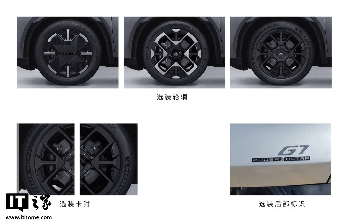 新车在前翼子板处装配了侧后向摄像头,还配备了隐藏式门把手、悬浮式外后视镜等设计细节。同时,小鹏 G7 增程版将提供三种字母“X”型轮辋造型以及熏黑刹车卡钳供消费者选择,并申报了 235/55 R19 和 255/45 R20 两种轮胎规格。