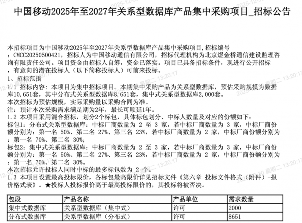 C114讯 12月30日消息(九九)中国移动采购与招标网日前发布2025年至2027年关系型数据库产品集中采购项目招标公告,预估采购规模为数据库10,651套,其中分布式关系型数据库8,651套,集中式关系型数据库2,000套。预计本次采购需求满足期为2年,最长可顺延1年。
