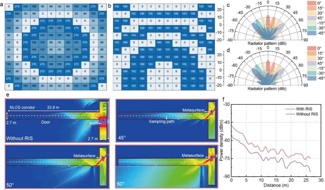 可重构智能超表面散射模式特性:(a)散射模式初始相位,(b)30°散射波束扫描编码,(c)E和(d)H面散射波束扫描特性,(e)L形走廊中的功率密度分布,(f)L形走廊盲区覆盖特性