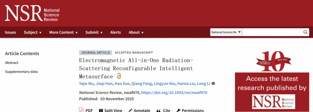 近日,西安电子科技大学李龙教授团队在这一领域取得重要突破,研究成果以《电磁多维融合辐射-散射可重构智能超表面》(Electromagnetic All-in-One Radiation-Scattering Reconfigurable Intelligent Metasurface)为题,发表于我国顶尖英文学术期刊《国家科学评论》。该研究提出并实现了一种“电磁多维融合幅散可重构智能超表面”,首次在统一硬件平台上实现了通信、感知、决策与无线供能的一体化融合,为6G网络与万物智联时代提供了全新的技术范式。