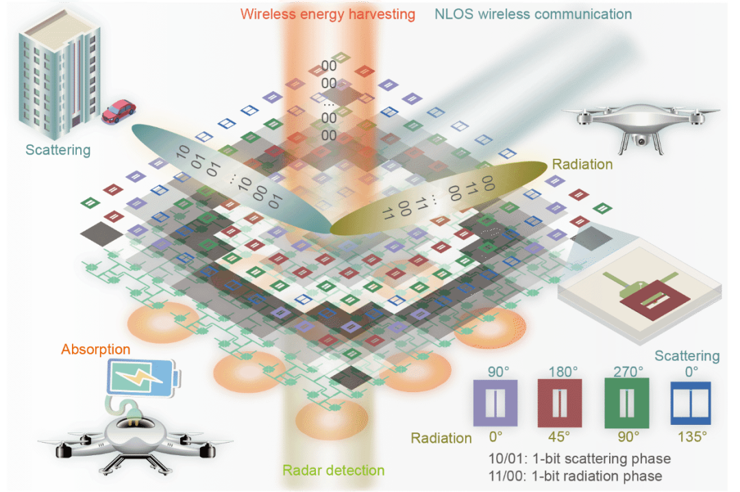 其工作流程充满智慧:在辐射模式下,超表面主动发射信号与网络交互;在接收模式下,它又能感知外部电磁环境变化,判断目标位置,自适应做出决策,并向目标进行无线信息和能量传输。与此同时,它还能收集环境中的无线能量,经整流后为其他设备充电,甚至为自身供电,实现自供给的闭环。