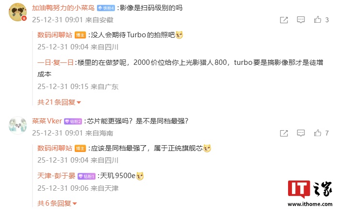 IT之家注意到,博主还回复了部分网友的问题:针对系列新机的影像是否为扫码级别?他表示“没人会期待 Turbo 的拍照吧