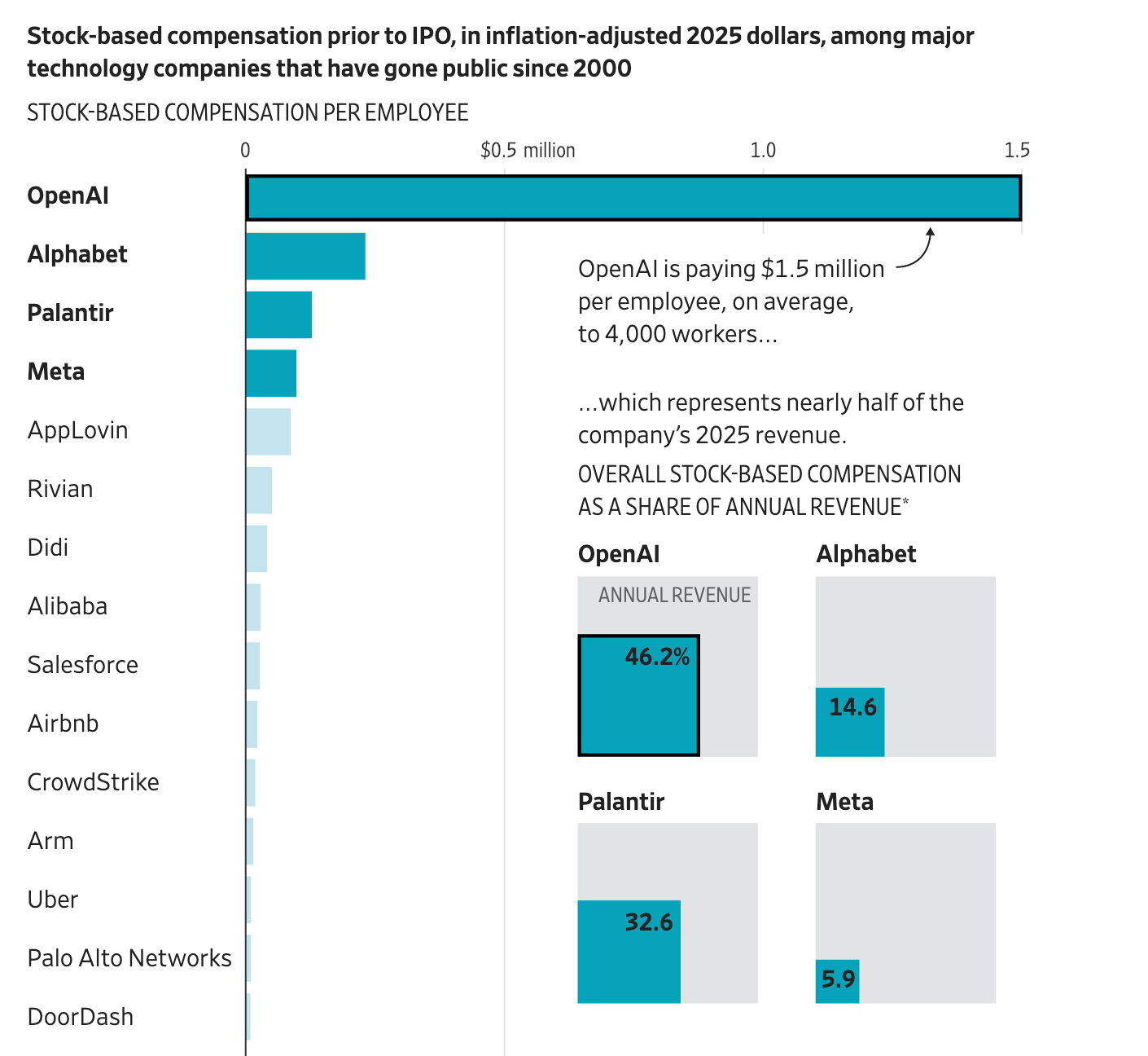 根据分析,OpenAI的薪酬支出占营收比例预计在2025年达到46%,在纳入研究的18家公司中仅次于Rivian(该公司在IPO前一年尚未产生营收)。Palantir在2020年上市前一年的股权薪酬占营收比例为33%,谷歌为15%,脸书为6%。