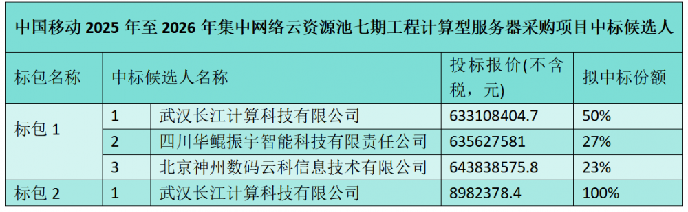C114讯 12月31日消息(九九)中国移动2025年至2026年集中网络云资源池七期工程计算型服务器采购项目中标候选人公示,长江计算等三家中标。