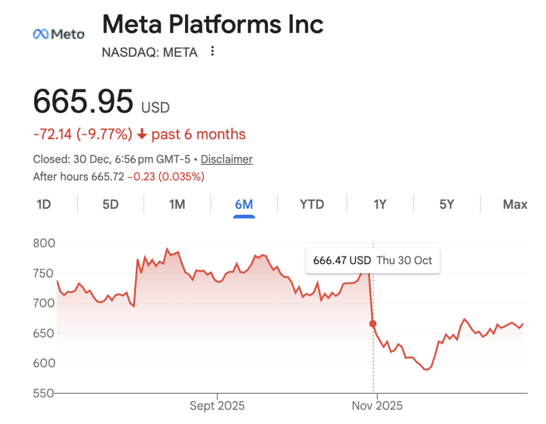 当扎克伯格在 10 月 30 日宣布 2026 年 AI 资本支出将大幅增加时,股价单日下跌 11%,市值一夜蒸发 2140 亿美元,相当于一夜跌掉 107 个 Manus。