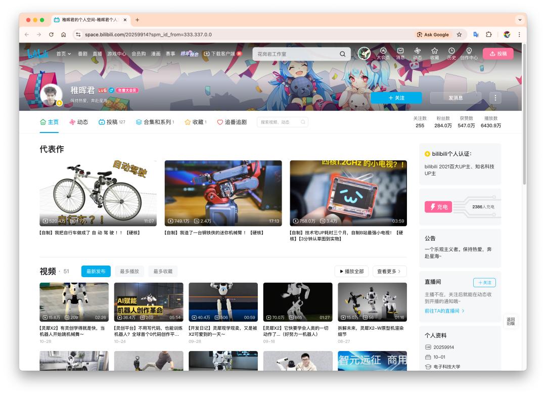 ▲ 彭志辉(稚晖君)的 B 站主页