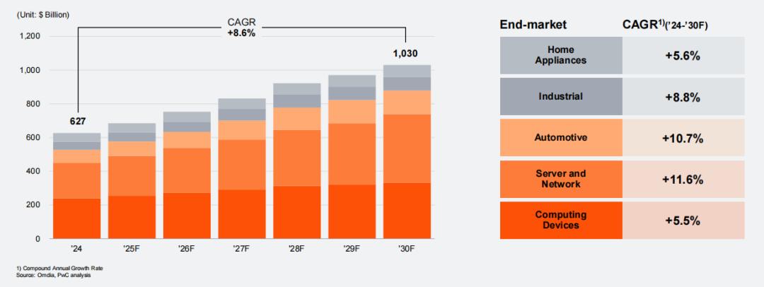 普华永道提出,在众多细分领域中,服务器与网络半导体预计将保持11.6%的年增长率领跑增长,这主要得益于生成式AI服务的迅猛发展。紧随其后的是汽车领域,预计将以10.7%的年增长率位居第二,这得益于电动汽车和自动驾驶技术的突破性进展。