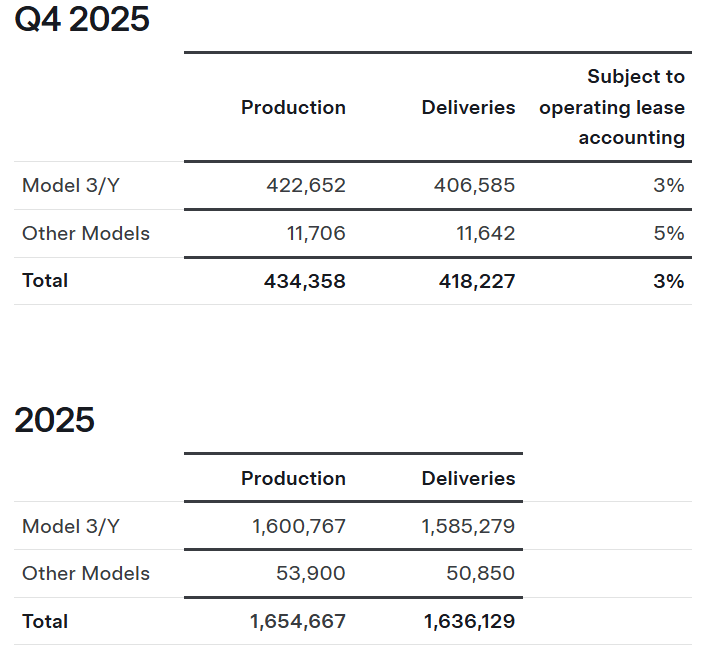 具体来看,2025年第四季度特斯拉Model 3/Y车型生产422,652辆,交付406,585辆,同比增长3%;其他车型生产11,706辆,交付11,642辆,同比增长5%。综合计算,第四季度特斯拉车辆生产总计434,358辆,交付总计418,227辆,同比增长3%。