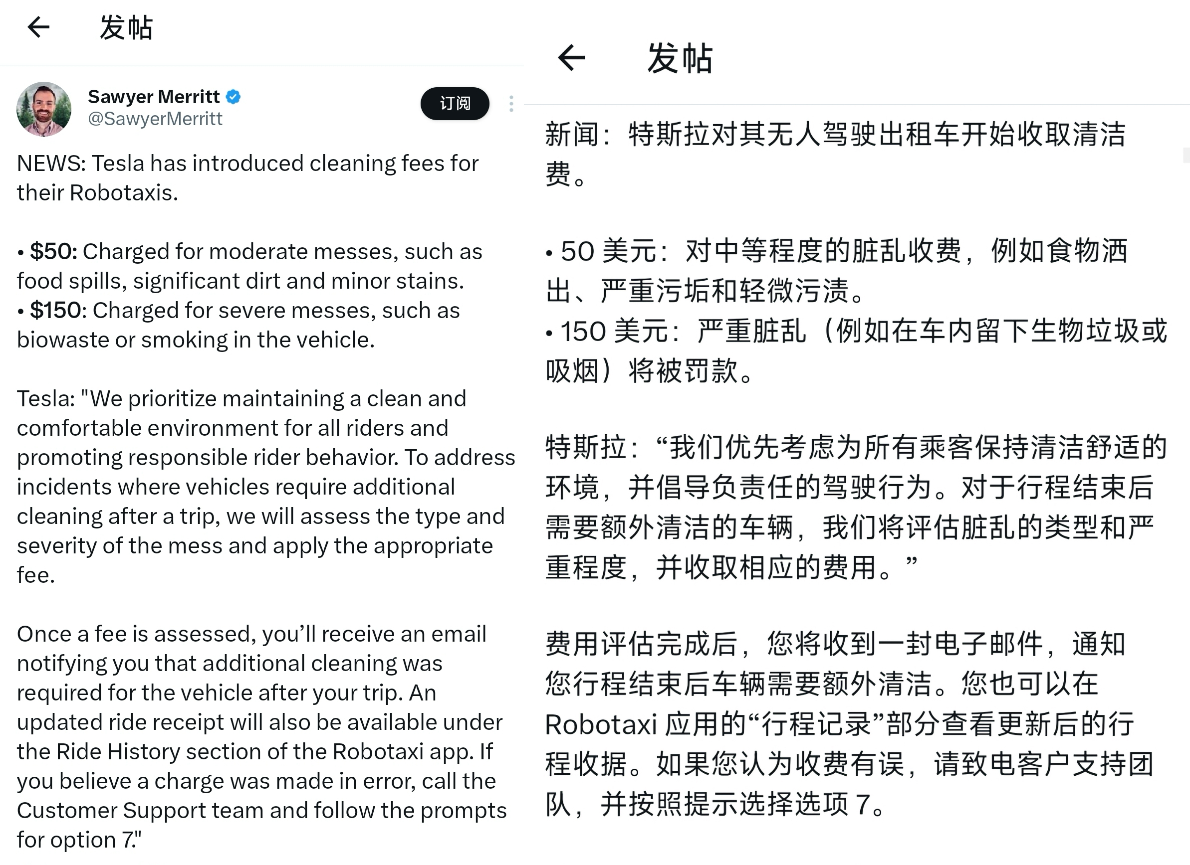 所以,要想解决这一争议,核心并非「清洁费是否该收」,而是「收费标准如何制定」,以及「判定依据如何提高说服力」,这也是特斯拉Robotaxi需要解决的难题。