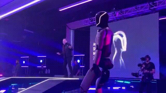 现场,马斯克激动地和机器人擎天柱「Optimus」共舞: