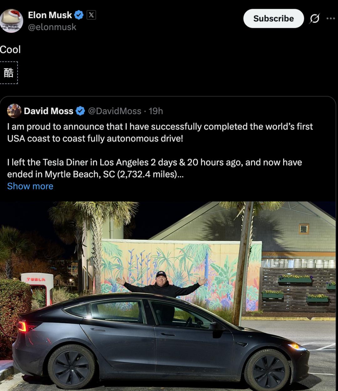 马斯克10年梦成真!特斯拉全球首次自动驾驶横穿美国,人类0接管