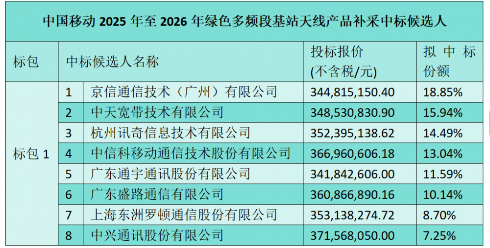 C114讯 1月5日消息(九九)中国移动采购与招标网日前发布2025年至2026年绿色多频段基站天线产品(补充采购)集中采购项目中标候选人公示,京信通信、中天宽带等八家中标。