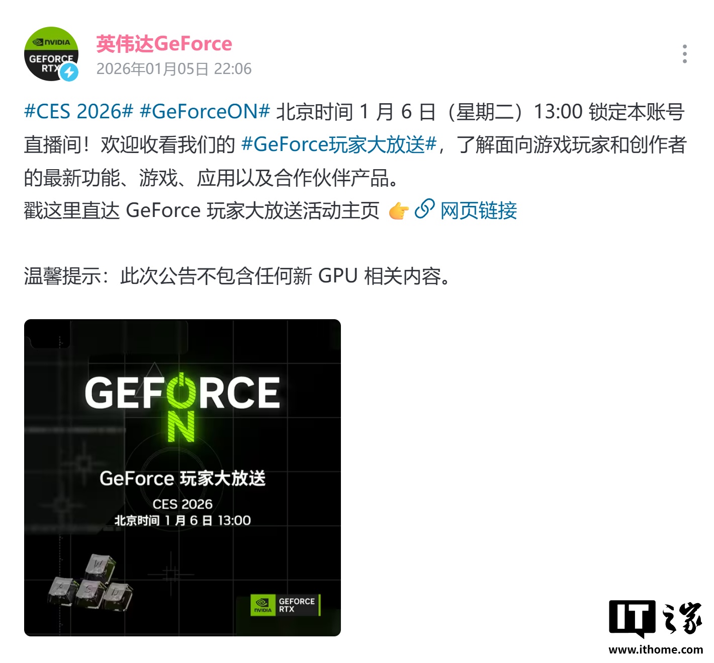 IT之家 1 月 5 日消息,英伟达官方今晚 10 点在B站宣布,CES 2026 期间举办的“GeForce 玩家大放送”活动将在明天(1 月 6 日)13:00 开启。