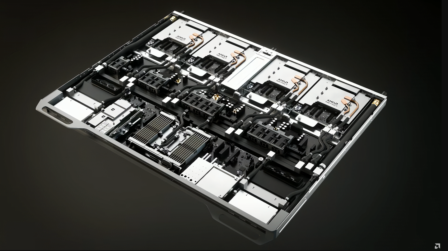 Helios 机架采用全液冷设计,配备四个 Instinct MI455X GPU 和一个 EPYC Venice Zen6 CPU。该系统采用 AMD 的 Pensando“Salina”400 DPU,以及 Pensando“Vulcano”800 AI NIC 用于网络和互连。