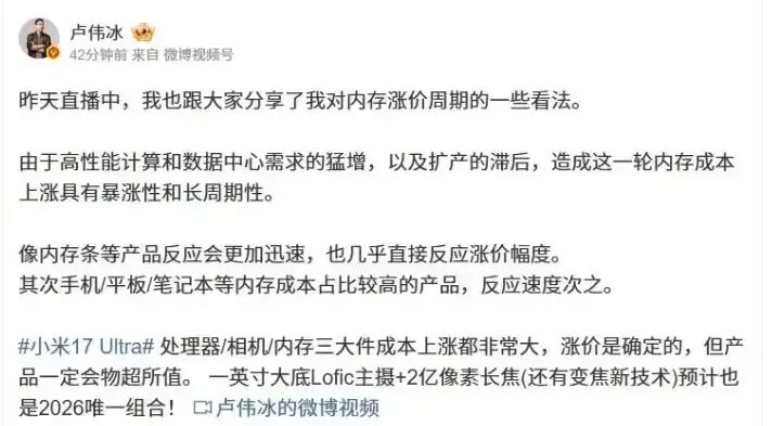 早在发布之前,小米集团合伙人、总裁卢伟冰就在微博上吹风,称小米17 Ultra的涨价是确定的。