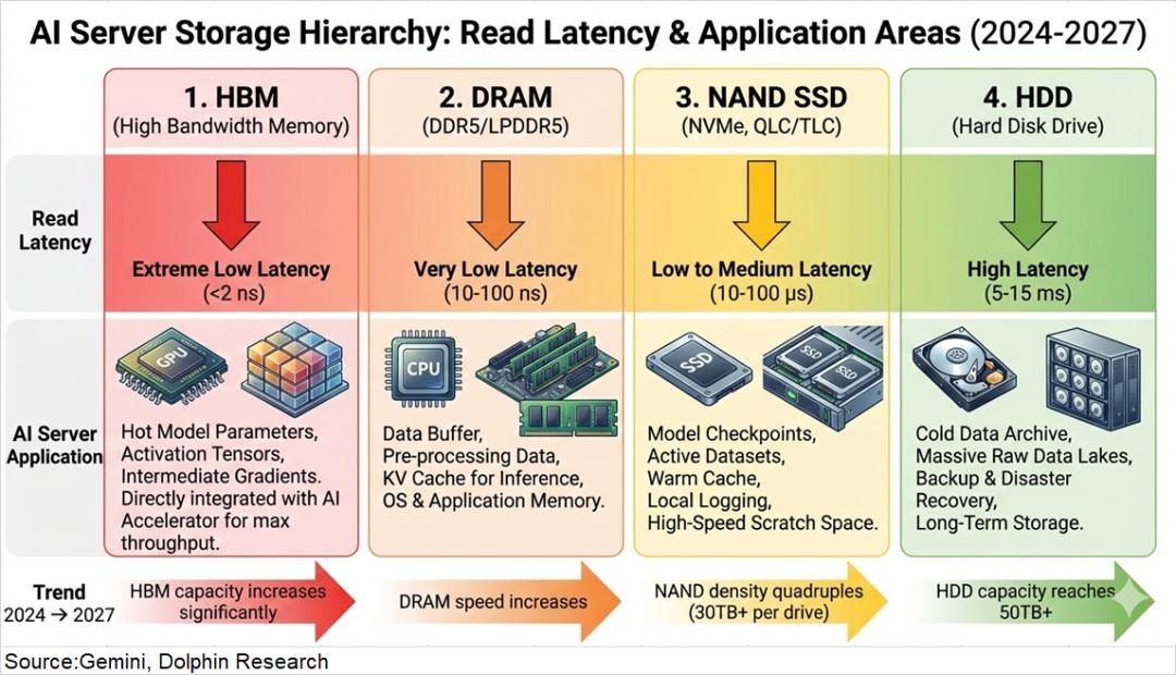 各类存储产品在AI服务器中都是什么角色呢,具体来看: