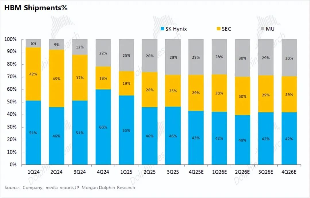 值得注意的是,HBM的产能情况并不等于出货量表现。参考三星,它的HBM产能虽然相对较高,但由于公司在HBM3E工艺中良率偏低并迟迟未能实现对英伟达的供货,因而三星的HBM实际出货量的占比下滑至了3成以下。