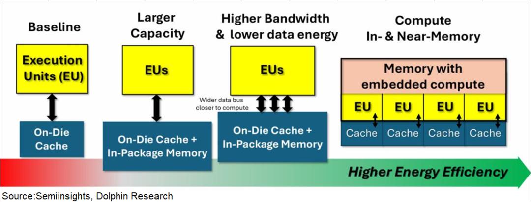短期来看,HBM向16-Hi堆叠升级(带宽提升至16-32TB/s)与3D堆叠SRAM的商用(延迟压缩至 2ns)形成互补解决方案;中长期则依赖存算一体架构的突破,彻底消除数据搬运的速度问题。