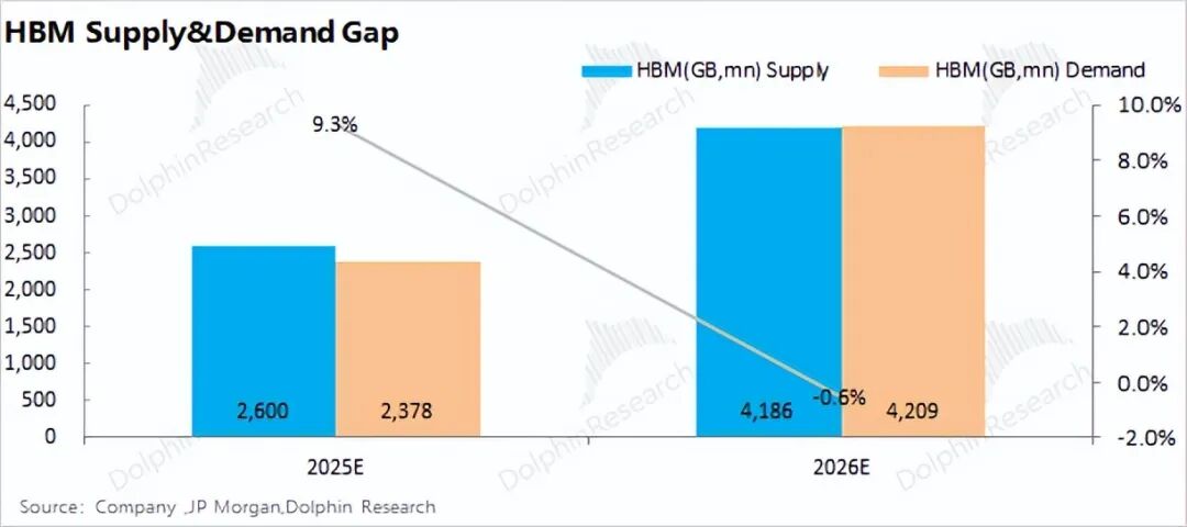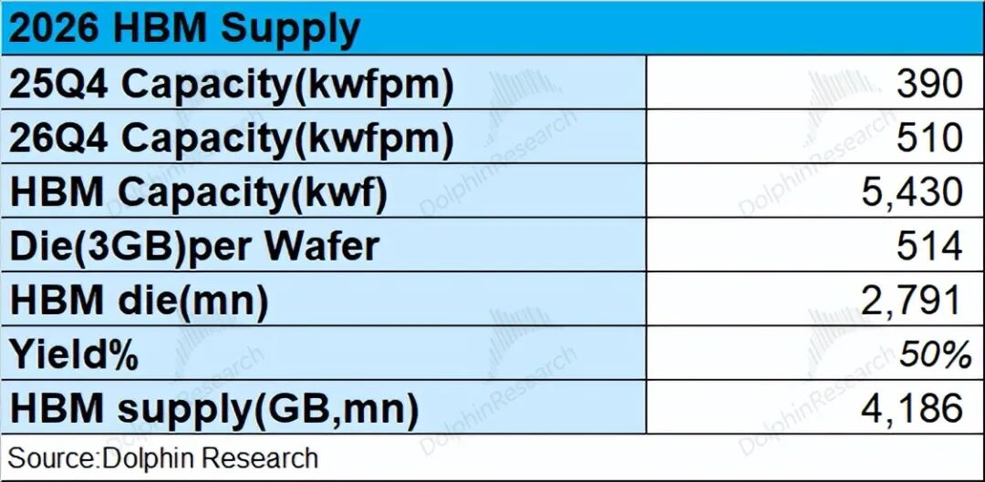 从上文的三家公司合计产能来看,2025年四季度的HBM月产能约为39万片,至2026年四季度HBM的月产能有将达到51万片。考虑到产能爬坡因素,海豚君预估2026年HBM的合计总产能有望达到543万片。