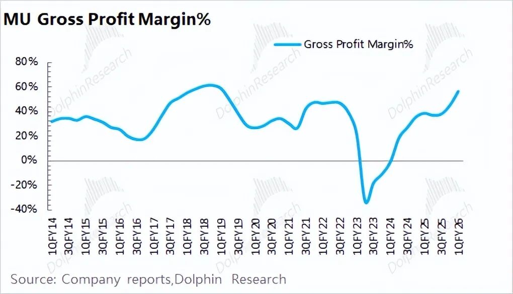 在AI需求的带动下,存储行业从HBM领域延伸至传统存储领域开启了本轮全面上行周期。以美光为例,在存储产品持续涨价的带动之下,公司的毛利率已经到了相对高位。美光公司更是将下季度毛利率指引给到了66-68%,创出历史新高,这也意味着这轮存储周期的猛烈程度是高于以往的。