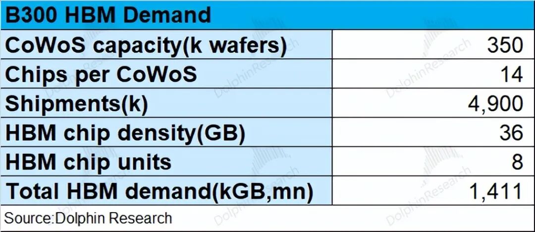 单个B300芯片配备8个HBM3E,而每个HBM3E都为36GB的容量,因而单个B300需要288GB的HBM3E。那么490万个B300芯片,则需要14亿GB的HBM。