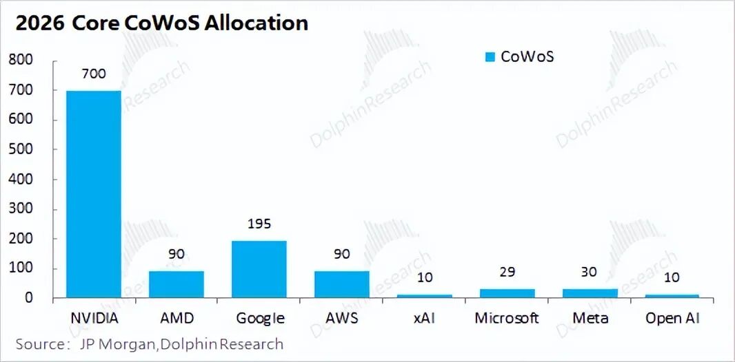 结合行业及市场预期的情况看,在2026年的CoWoS分配中英伟达仍占据着最大的份额(占据总量的一半以上),谷歌、AMD和亚马逊也是CoWoS较大的下游客户。假定下图中所列的核心客户占据了90%的CoWoS需求,那么全球CoWoS在2026年的全年需求量大约在128万片左右。