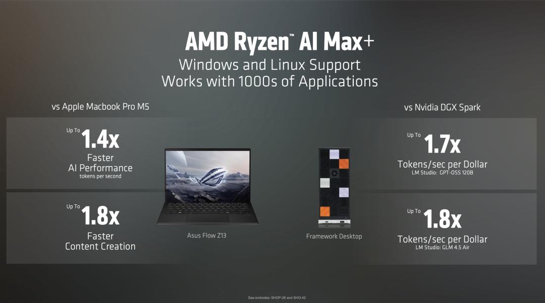 - 对比Nvidia DGX Spark:最令人意外的是,AMD将笔记本芯片与英伟达的工作站级别产品对比。