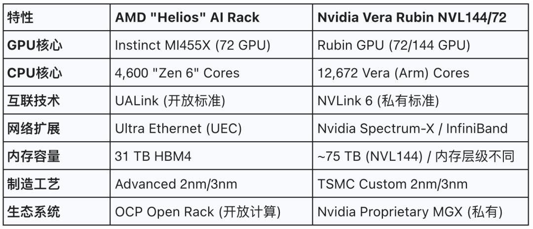 为了更直观地理解这场对决,我们将Helios与英伟达的NVL平台进行了详细对比: