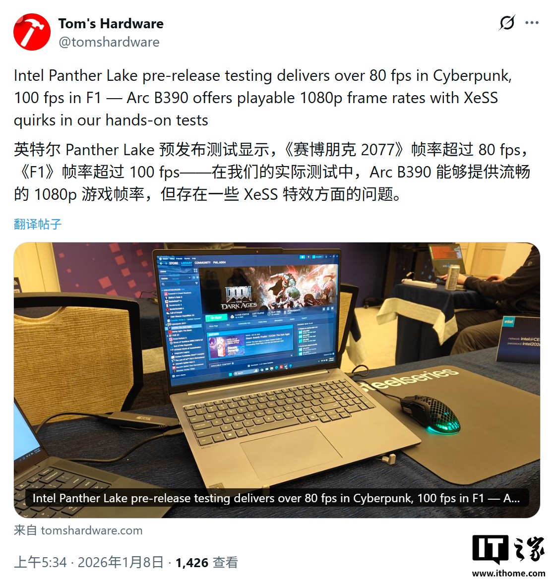 IT之家 1 月 8 日消息,科技媒体 Tom's Hardware 今天(1 月 8 日)发布博文,报道称在 CES 2026 展会期间,通过联想参考设计机型,实际测试了英特尔 Panther Lake 处理器的性能。