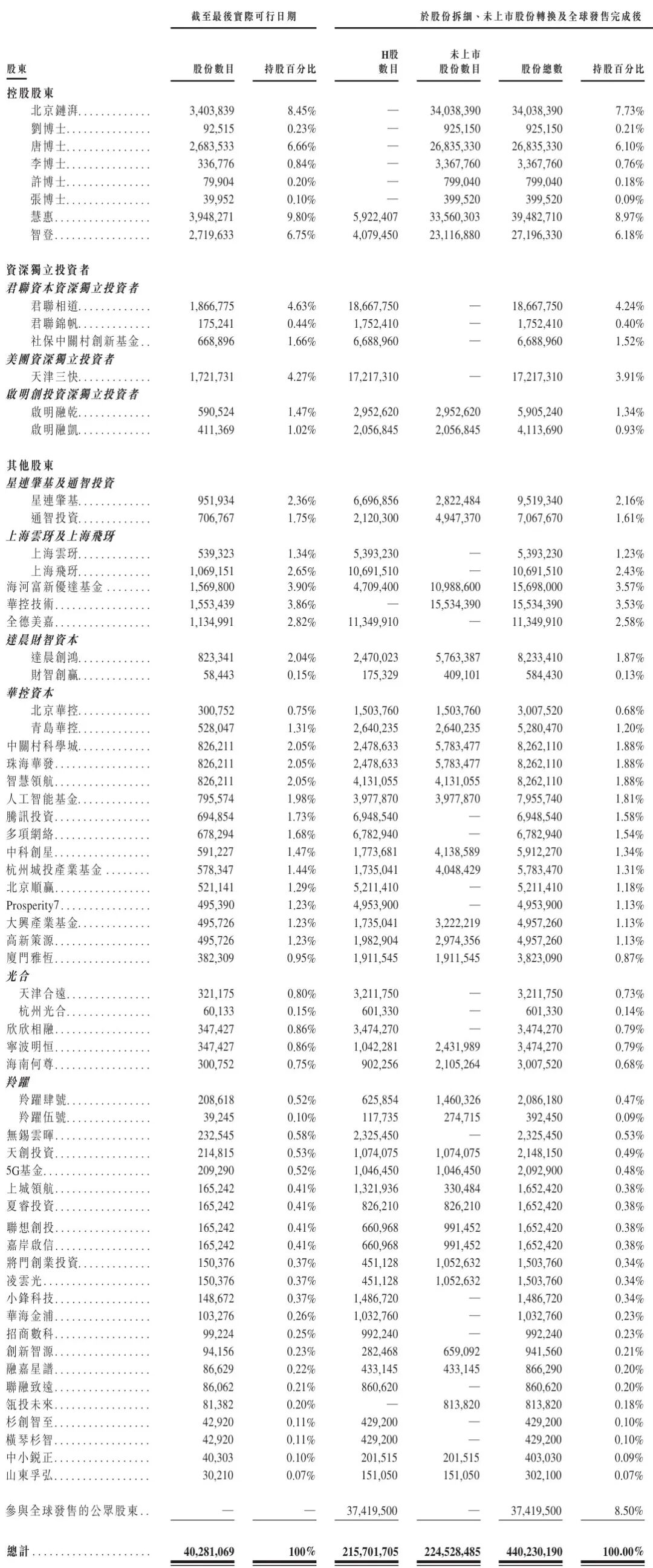 达晨创鸿持股为2.04%,财智创赢持股为0.15%;北京华控持股为0.75%,青岛华控持股为1.31%;中关村科学城、珠海华发、智慧领航分别持股为2.05%;人工智能基金持股为1.98%,腾讯投资持股1.73%,多项网络持股为1.68%,中科创星持股为1.47%,杭州城投产业基金持股为1.44%;