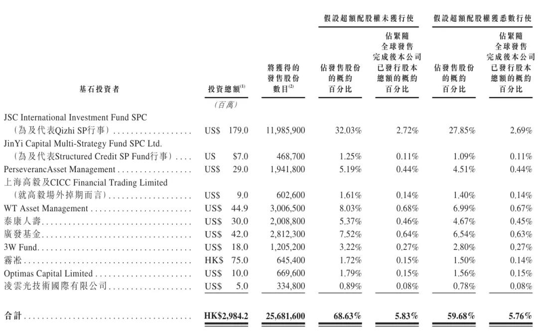 其中,JSC International Investment Fund SPC认购1.79亿美元,JinYi Capital Multi-Strategy Fund SPC Ltd认购700万美元,PerseverancAsset Management认购2900万美元,上海高毅认购900万美元,WT Asset Management认购4490万美元,泰康人寿认购3000万美元,广发基金认购4200万美元,3W Fund认购1800万美元,雾凇认购7500万美元,Optimas Capital Limited认购1000万美元,凌云光技术国际有限公司认购500万美元。