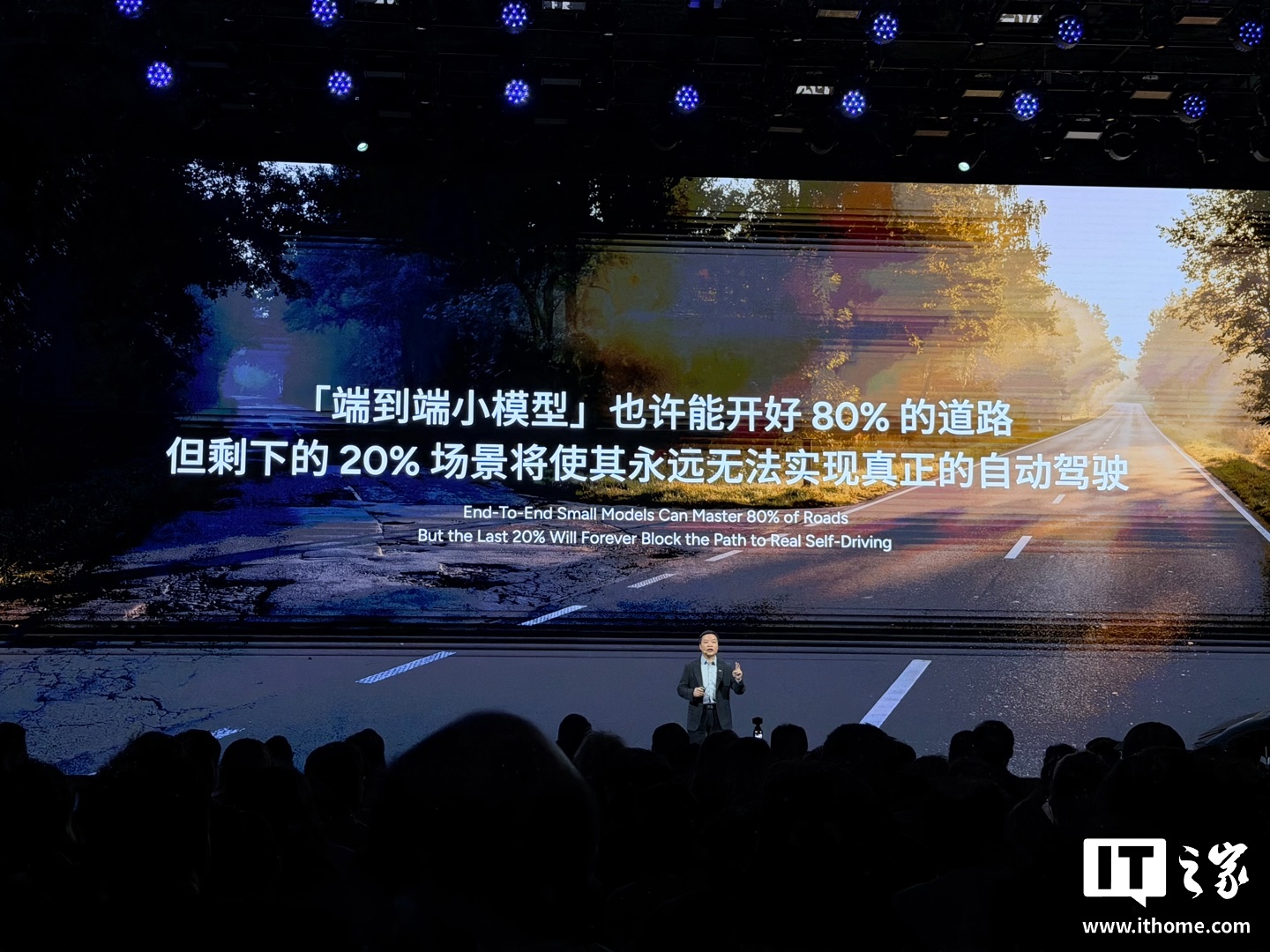 何小鹏表示,目前的“端到端小模型”也许能开好 80% 的道路,但剩下的 20% 场景将使其永远无法实现真正的自动驾驶。
