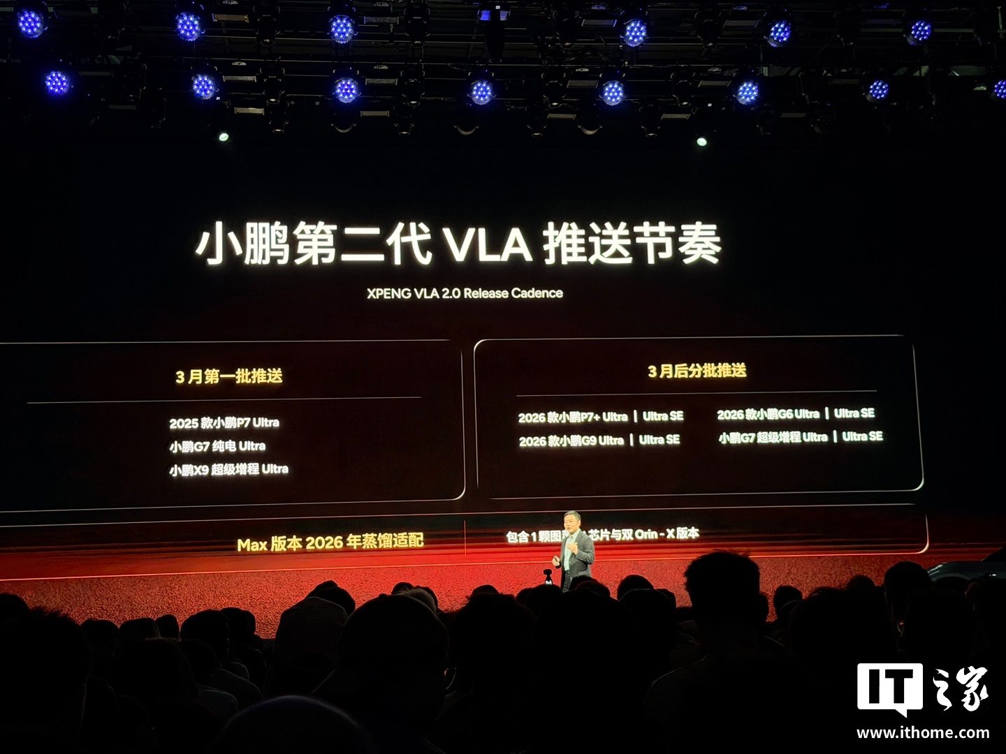 IT之家 1 月 8 日消息,在 2026 小鹏全球新品发布会上,小鹏汽车董事长何小鹏公布了第二代 VLA 推送节奏:3 月第一批推送、3 月后分批推送。据介绍在,大模型 + 大算力 + 大数据三点共同作用下,小鹏第二代 VLA 将快速地带来接近 L4 的智驾体验