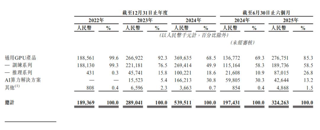 具体来看,通用GPU产品依然是公司绝对的收入支柱。2022年-2025年上半年,分别贡献了总营业收入的99.6%、92.3%、68.5%及85.3%。