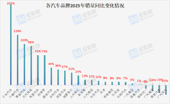 在新能源汽车领域,比亚迪继续保持绝对领先地位,460.24万辆的销量成为全球新能源汽车销量冠军。零跑汽车、小鹏汽车等新势力车企也实现了高速增长,同比增长率分别达到103.13%和125.88%,反映出新能源汽车市场仍具有较大的增长空间。小米汽车作为跨界入局者,2025年即交付41.16万辆,大幅超越其35万辆的年度目标,旗下两款车均成为现象级产品,其增长动能不容小觑。