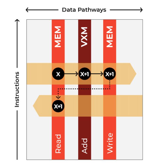 下图展示了 GroqChip 如何利用异构线程或“直线”线程,即线程不分支,而是对应不同的执行功能单元。数据路径在两个方向上完全流水线化。指令垂直流水线化,而数据流向东西方向流动,在功能单元处交叉执行运算,充分利用了局部性。我们可以从内存读取数值,在向量单元上进行运算,然后将结果存回内存。此外,GroqChip 将计算与内存访问解耦——这对于实现更高的内存级并行性(MLP)至关重要,使大量读写操作可以同时处于在途状态。这意味着 GroqChip 在单步内即可完成有效的计算与通信,提供低延迟、高性能以及可预测的准确性。