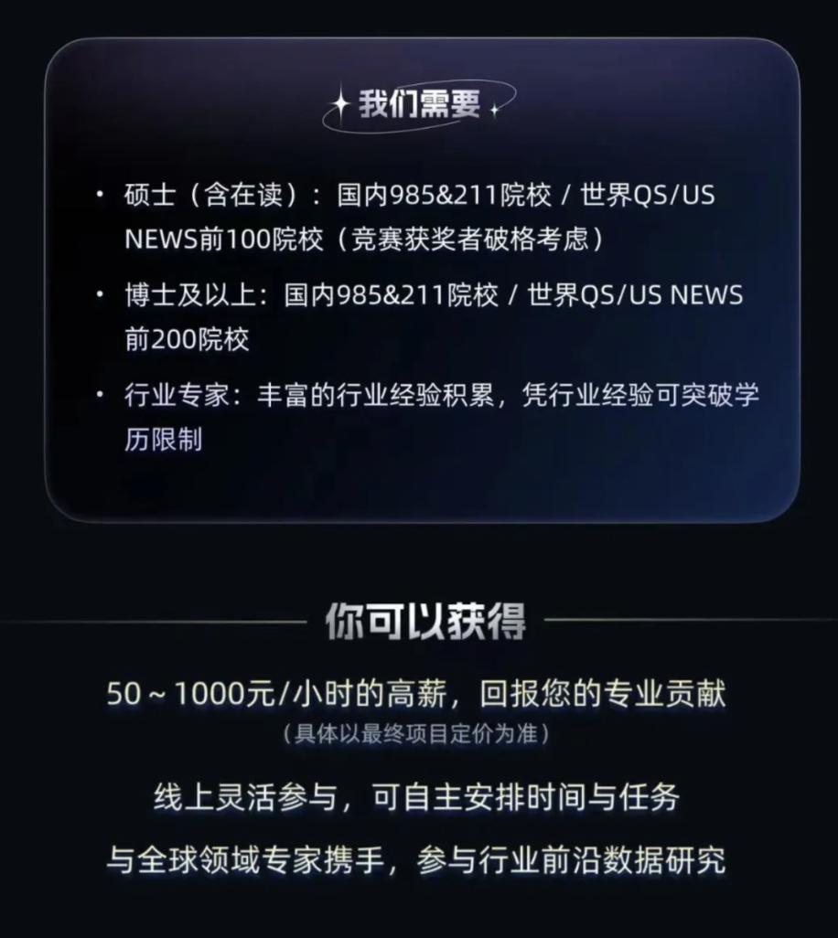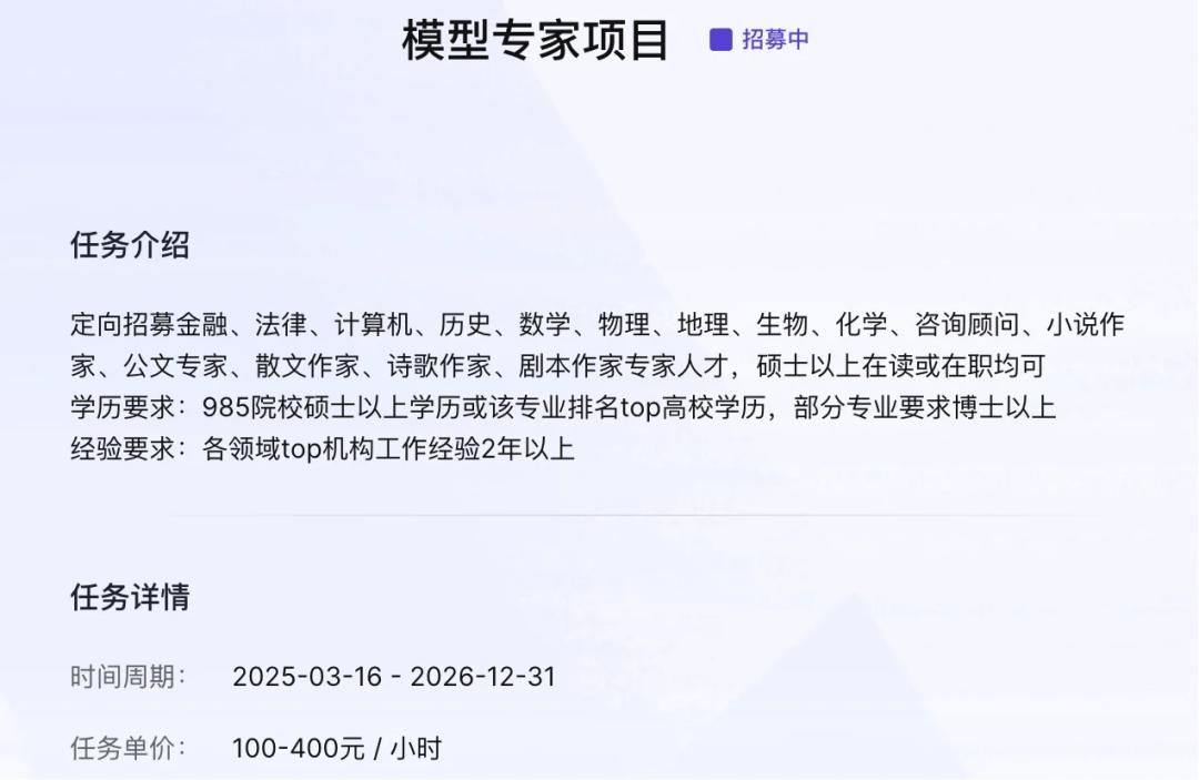 如今的门槛究竟卷到了什么地步?在某个标价100-400元/小时的“模型专家项目”招聘介绍中,要求几乎媲美大厂社招,卡985硕士的学历,卡高壁垒的专业背景,还卡2年以上的工作经验。