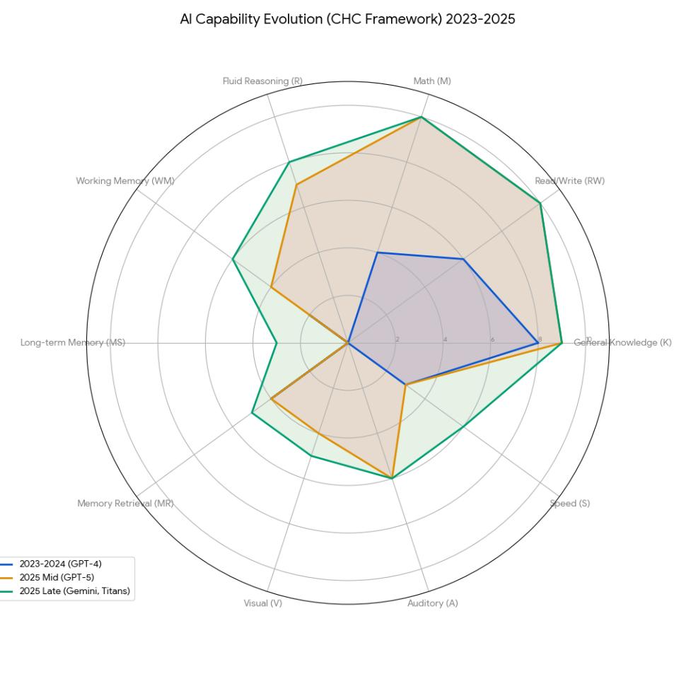 第二,现在的技术瓶颈主要在模型要“不仅要博学,更要懂思考和能记住”。 通过Yoshua Bengio提出的AGI框架(基于CHC认知理论),我们发现之前的AI存在严重的「能力偏科」:它在一般知识(K)上得分极高,但在即时推理(R)、长期记忆(MS)和视觉处理(V)上几乎是空白。这种不平衡构成了通往AGI的最大阻碍。