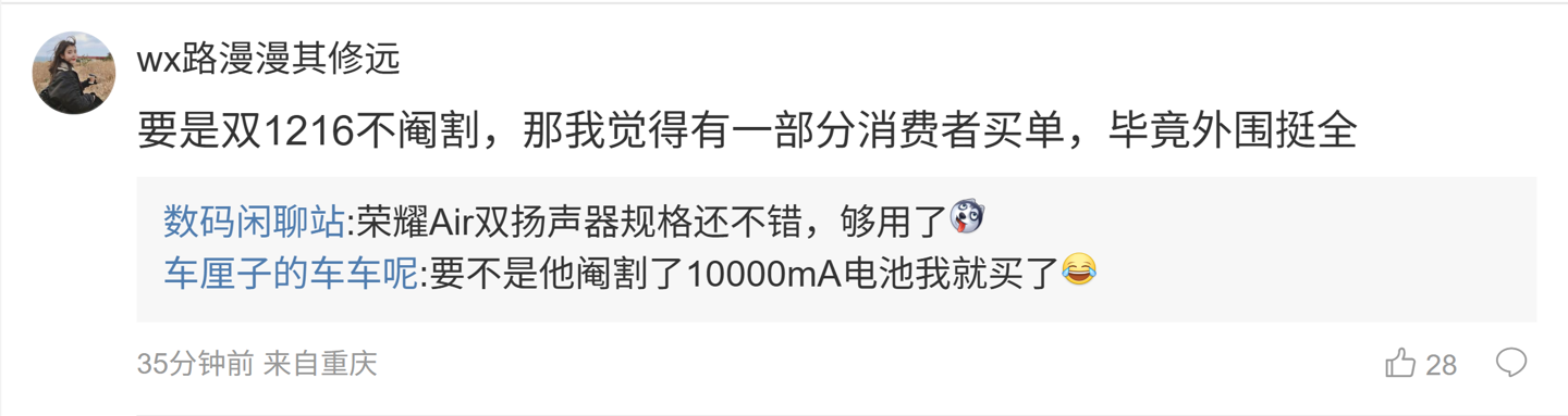 后续有用户在评论区表示:“要是双 1216 不阉割,那我觉得有一部分消费者买单,毕竟外围挺全”,博主回复道:“到底是哪家?”,博主则表示:“最近流出工程机外壳那家”。