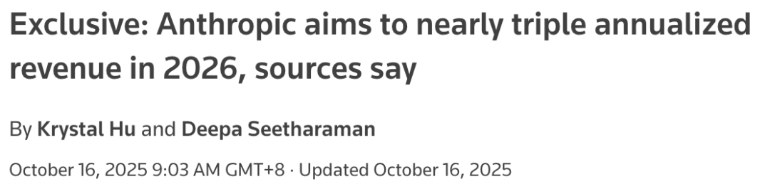 据路透社报道,知情人士透露 Anthropic 有望在 2025 年底前实现内部设定的 90 亿美元年化营收目标,并预测其 2026 年年化营收增长将接近 3 倍,目标区间约为 200–260 亿美元。
