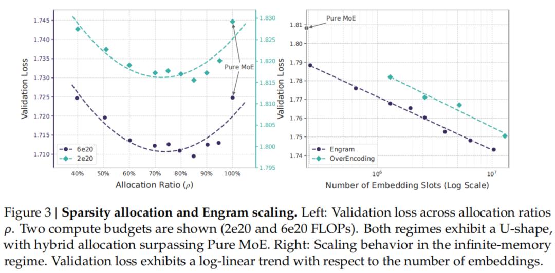 通过「稀疏分配」(Sparsity Allocation)建模,他们意外发现MoE与Engram之间,存在「U形scaling law」。