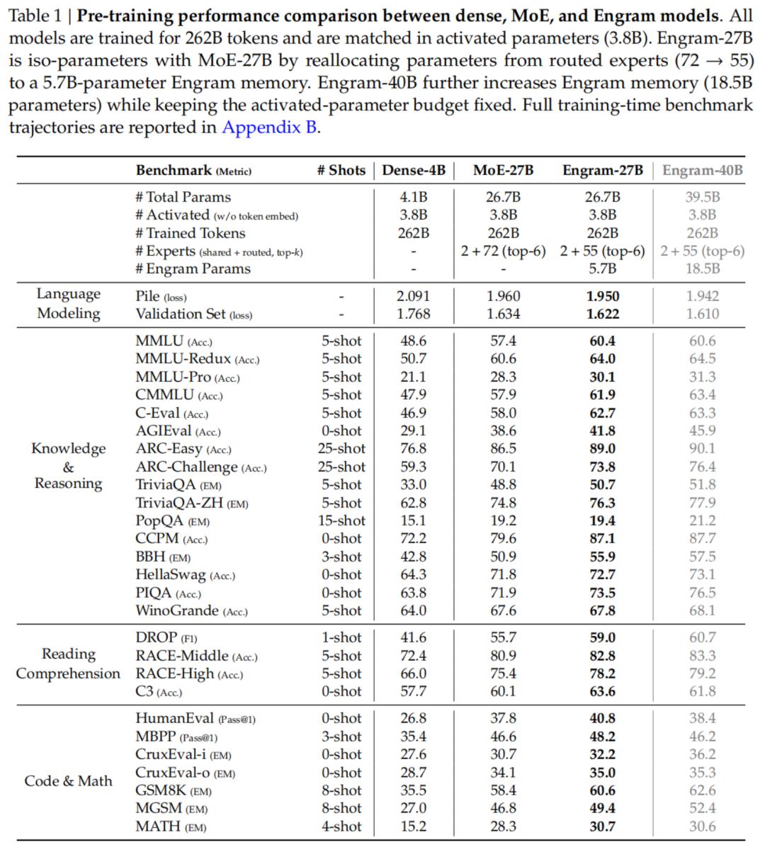 最后,扩展到Engram-40B进一步降低了预训练损失,并在大多数基准测试中提升了性能。
