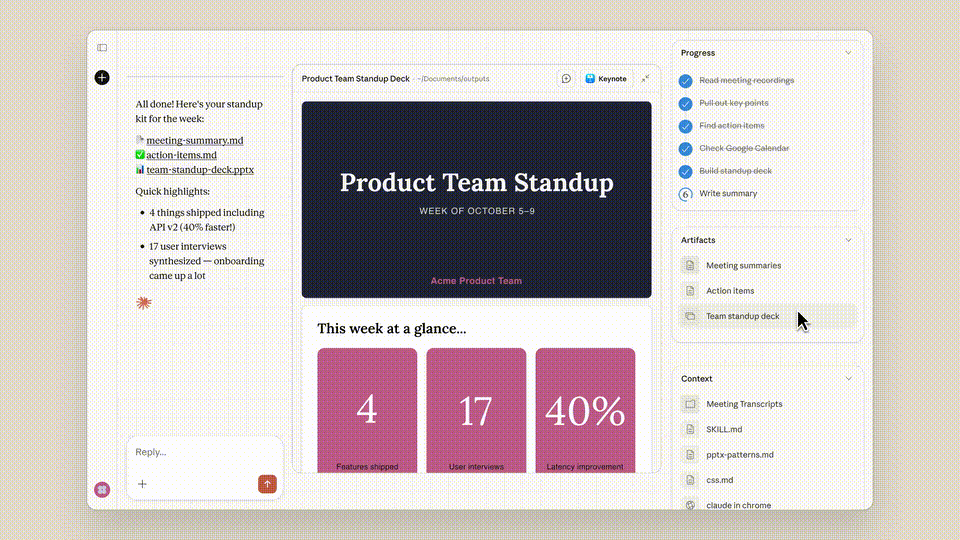 同时,Anthropic内置了第一批技能(skills),专门强化Claude文档、PPT、表格、邮件等常见办公产出能力。