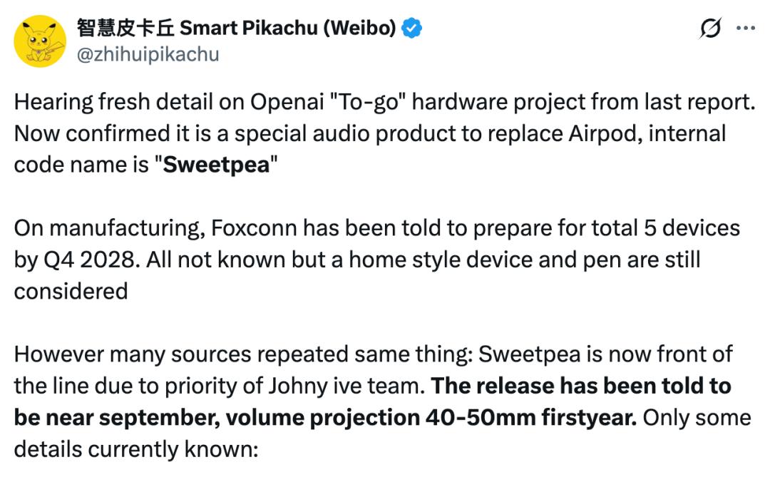 该硬件已被确认是一款取代 AirPods 的特殊音频产品,内部代号为「Sweetpea」(香豌豆)。