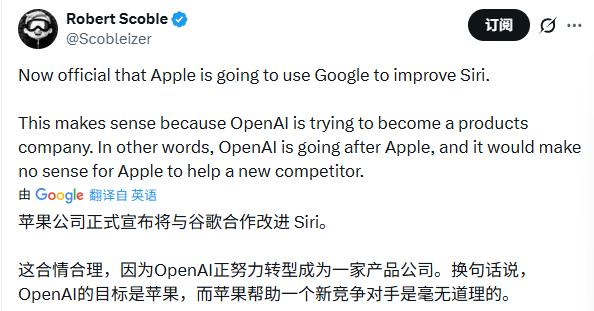 科技记者、知名博主罗伯特·斯考伯在社交媒体上评论:“苹果意识到OpenAI即将推出的消费级AI设备将与iPhone展开竞争。苹果帮助一个新竞争对手是毫无道理的。” 选择与谷歌深度合作,既能获得顶级技术,又能避免过度扶持一个未来的硬件对手,可谓一举两得。