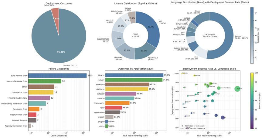 通过这一多阶段漏斗流程,团队将最初约50万个仓库,收敛为52,550个进入自动部署流程的科学工具候选。这一步的意义,不仅在于筛选工具,更在于第一次以结构化方式刻画了真实科学工具世界的规模与边界。
