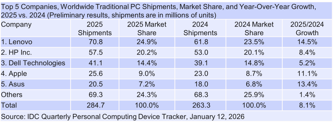 IT之家注意到,2025 年第四季度,联想出货 1930 万台排名第一,同比增长 14.4%;惠普出货 1540 万台,同比增长 12.1%。戴尔以 18.2% 的增速位居前三名之首,出货量为 1170 万台;苹果该季度的 Mac 出货量为 710 万台,与去年同期基本持平;华硕出货量为 540 万台,同比增长 10.9%。