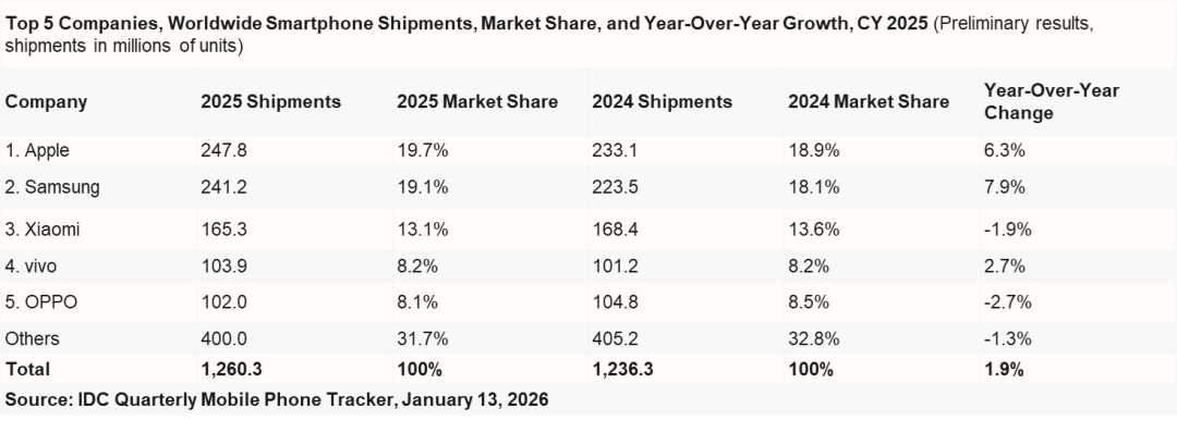 2025 全年,全球智能手机出货量达到 12.6 亿部,同比增长 1.9%。