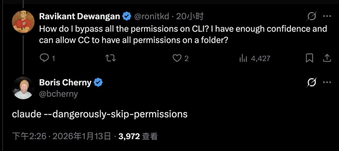 好在Claude团队在这方面也做了一些提醒措施,如果要给文件系统权限的话,命令参数是“危险地跳过许可”。