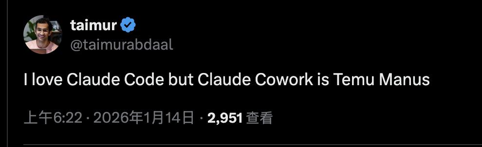 也有人认为目前Claude Cowork还比较早期,算是“拼多多版”Manus。